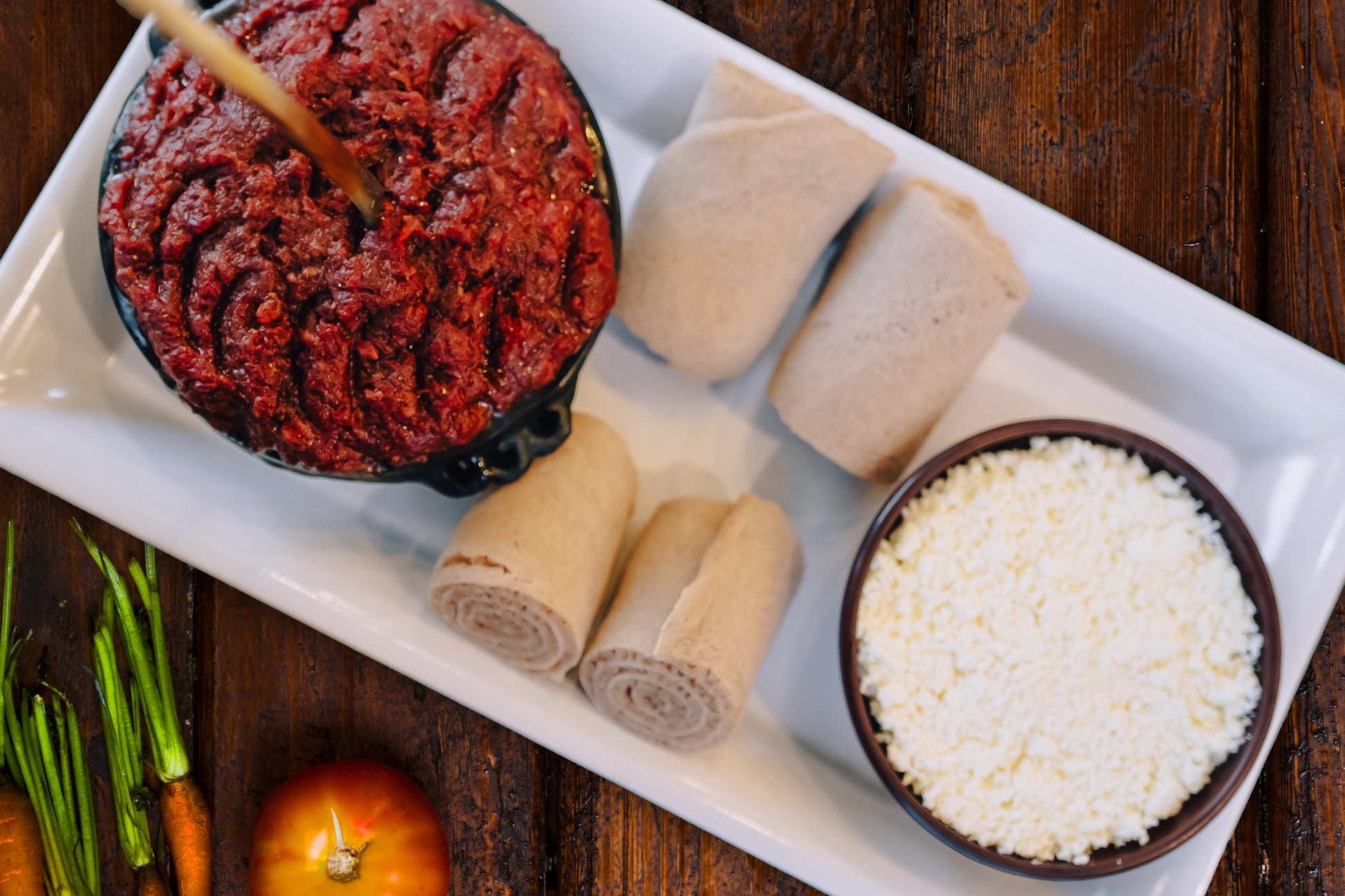 Kitfo is a traditional Ethiopian dish renowned for its rich flavors and unique preparation. It features finely minced raw beef that is seasoned with a blend of mitmita (a potent Ethiopian chili powder) and niter kibbeh (clarified spiced butter). This combination of spices and butter infuses the meat with a deep, savory taste and a delightful warmth.